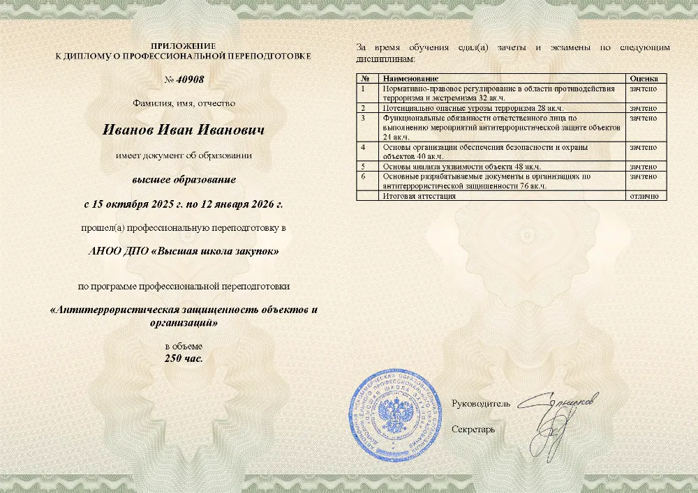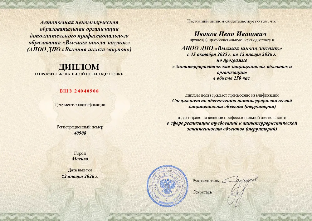 Профессиональная переподготовка, 250 академических часов, 6 модулей: нормативно-правовое регулирование и угрозы терроризма, функциональные обязанности ответственных лиц, основы безопасности и охраны объектов, анализ уязвимости и разработка необходимой документации. Онлайн-обучение в в Горно-Алтайске с итоговой аттестацией.
