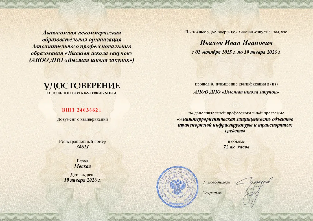 Повышение квалификации, 72 академических часов, 7 модулей: нормативно-правовые основы противодействия терроризму, анализ угроз и рисков, функциональные обязанности ответственных, инженерно-техническая укрепленность, документооборот и действия персонала при ЧС. Онлайн-обучение в в Горно-Алтайске с итоговой аттестацией.