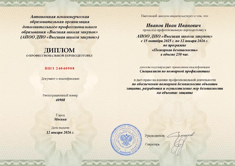 Профессиональная переподготовка, 250 академических часов, 11 модулей: организационные основы и законодательство в области пожарной безопасности, лицензирование и надзор, требования к объектам защиты, проектирование, тушение пожаров и оказание первой помощи пострадавшим. Онлайн-обучение в в Горно-Алтайске с итоговой аттестацией.