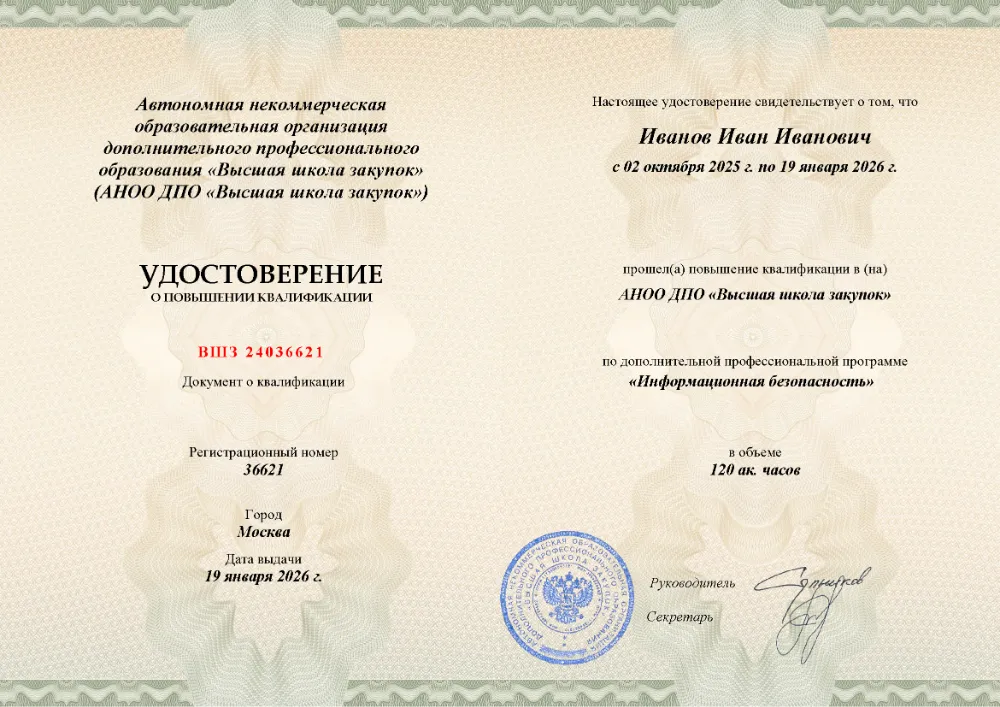 Повышение квалификации, 120 академических часов, 17 модулей: понятие, угрозы и законодательство в сфере ИБ, стандарты и управление рисками, административные и технические меры защиты, криптография, идентификация и обеспечение доступности. Онлайн-обучение в в Горно-Алтайске с итоговой аттестацией.