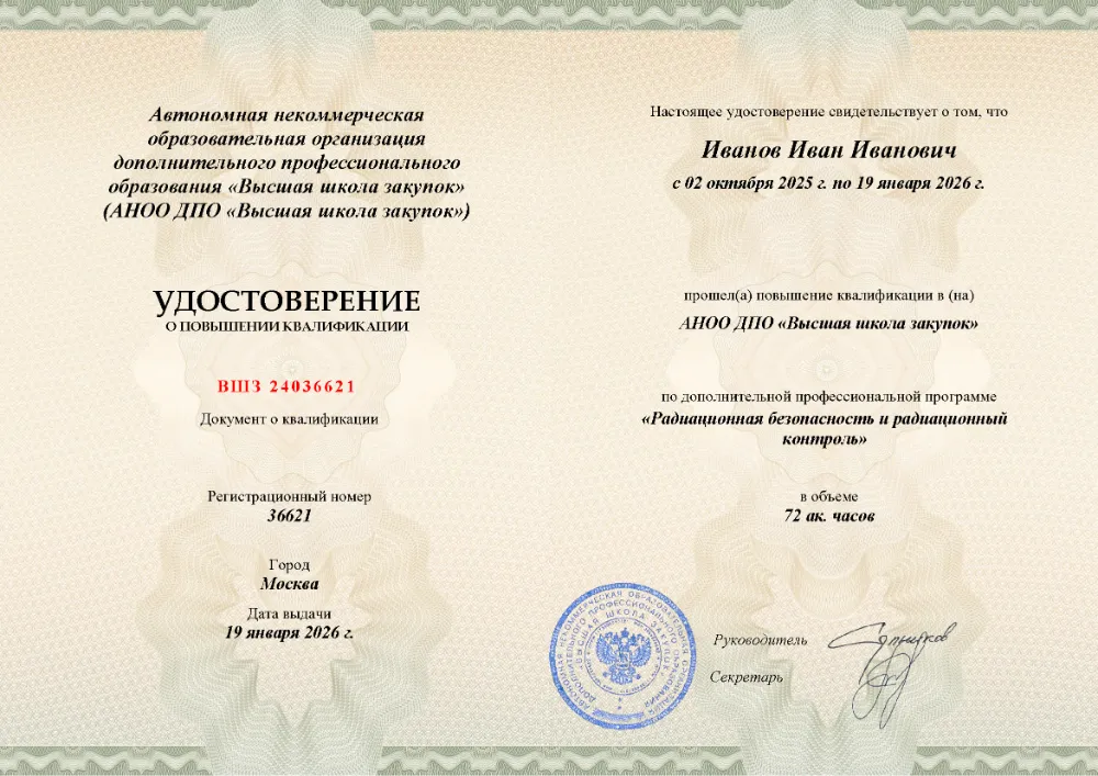 Повышение квалификации, 72 академических часа, 7 модулей: правовые и организационные основы деятельности, физические основы РБ и дозиметрия, учет РАВ и РАО, организация производственного контроля, обеспечение безопасности и физической защиты, документационное обеспечение и подготовка персонала. Онлайн-обучение в в Горно-Алтайске с итоговой аттестацией.